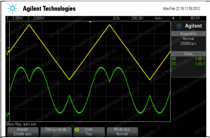下圖中黃色的曲線(xiàn)是鋸齒波射頻的電信號(hào)(10Vpp)作用于電光強(qiáng)度調(diào)制器MX-LN-10調(diào)制器射頻接口上。綠色曲線(xiàn)是強(qiáng)度調(diào)整器輸出的光強(qiáng),通過(guò)測(cè)量p相移所需的電壓,VpRF=4.8V@1540nm。使用不同頻率的射頻電信號(hào),我們可以測(cè)得對(duì)應(yīng)頻率下的VpRF。但是這種測(cè)量方法,并且隨著頻率的升高,所需的高頻設(shè)備也會(huì)變得非常昂貴。