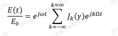 貝塞爾函數(shù)模擬計(jì)算如下圖所示,當(dāng)調(diào)制深度(modulation index)γ=2.4的時(shí)候,載波(紅線(xiàn))強(qiáng)度為零,調(diào)制深度定義為:
