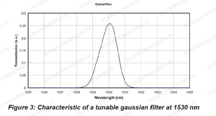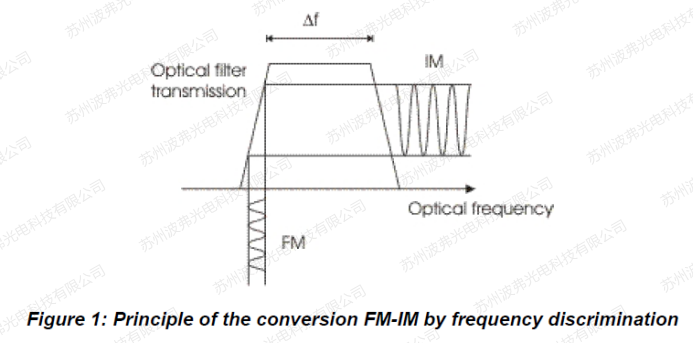 頻率鑒別(Frequency discrimination)用于啁啾測量。它只是在調(diào)制器的輸出端引入一個光學(xué)濾波器。為了該濾波器的頻率響應(yīng)與所用激光器的相匹配,可以使用可調(diào)諧濾波器。該濾波器必須在激光光源的波長范圍內(nèi)具有近似線性的斜率,比如,高斯濾波器是在傳輸峰值一半的位置??梢宰C明,純相位調(diào)制也可以表示為頻率調(diào)制。頻率偏移的幅度與頻率成正比。頻率越高,掃描的頻率范圍越寬。