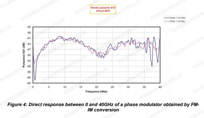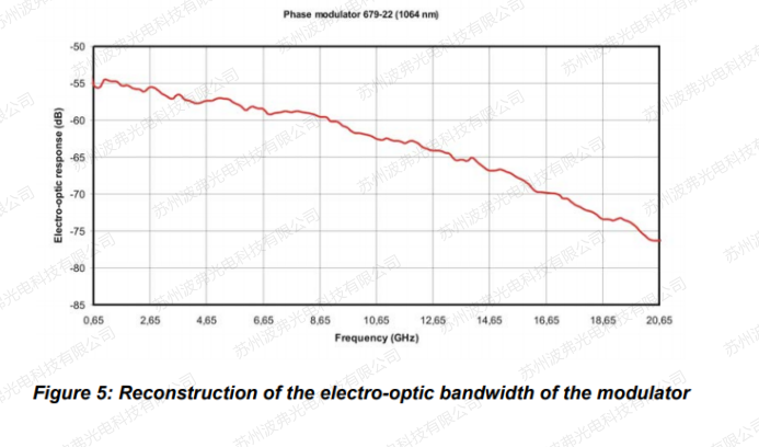 最終產(chǎn)生的強度調(diào)制的振幅取決于頻率f、濾波器的δf、先前校準過的驅(qū)動電壓以及要確定的調(diào)制器的頻率響應(yīng)。重要的一點是,必須工作在小信號模式以適應(yīng)信號Vo的振幅。調(diào)制器的電光響應(yīng)S21必須用頻率f歸一化。頻率越高,精度越高。在圖5所示的結(jié)果上,頻率響應(yīng)高于65MHz。