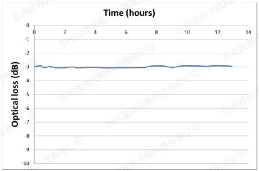 Figure 3 :使用退火質(zhì)子交換工藝的NIR-MX800-LN調(diào)制器插入損耗隨時(shí)間的穩(wěn)定性變化