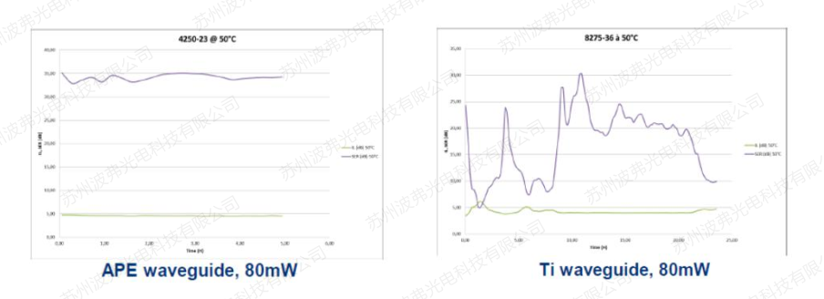 再一次聲明,即使在某些廠商的參數(shù)手冊(cè)上,鈦擴(kuò)散工藝制造出的調(diào)制器在近紅外波段優(yōu)于退火質(zhì)子交換工藝,但是鈦擴(kuò)散工藝的光折變效應(yīng)會(huì)在低激光功率時(shí)更早的介入,器件的性能將不再受控。所有iXblue近紅外波段的調(diào)制器使用退火質(zhì)子交換工藝,減小光折變的影響,提供更穩(wěn)定的性能。