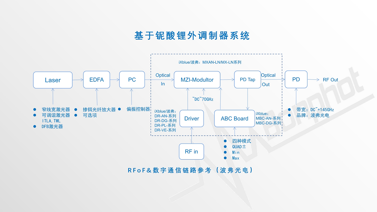 目前市面上RFoF系統(tǒng),有直接調(diào)制激光器(Directly modulated lasers)、電吸收調(diào)制器(Electro-absorption modulator)、鈮酸鋰外調(diào)制器(Lithium Niobate Mach-Zehnder Modulator)設(shè)計(jì)方式,相對(duì)于直接調(diào)制、電吸收調(diào)制器較容易收到帶寬、消光比性能限制,鈮酸鋰外調(diào)制器方式具有無(wú)可比擬的高帶寬、低插損、高線性等優(yōu)勢(shì)。