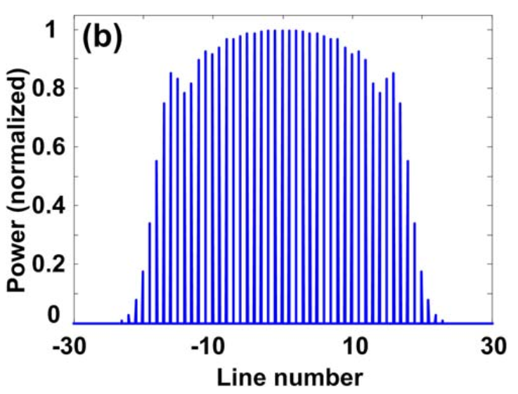 光學(xué)頻率梳(Optical Frequency Comb)是由一系列離散、等間距的規(guī)則光脈沖序列組成,能夠在一個頻段內(nèi)同時提供幾個至上百個個不同的頻率成分。具有梳線數(shù)目多、頻率范圍廣等優(yōu)勢,且具有固定的頻率間隔等,能夠代替多個激光器,是理想的多載波光源。