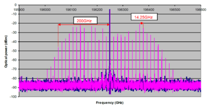 基于鈮酸鋰電光調(diào)制器所產(chǎn)生的光學(xué)頻率梳,原理是通過鈮酸鋰相位調(diào)制器(Phase Modulator),鈮酸鋰強(qiáng)度調(diào)制器(Intensity Modulator)的邊帶產(chǎn)生(參考微信公眾號:使用電光調(diào)制器實現(xiàn)邊帶調(diào)制),通過串聯(lián)鈮酸鋰相位調(diào)制器、強(qiáng)度調(diào)制器實現(xiàn)高平坦度(~2dB),多梳線光學(xué)頻率梳產(chǎn)生,最終產(chǎn)生上百個梳線的頻率梳?;阝壦徜囌{(diào)制器產(chǎn)生的光學(xué)頻率梳具有中心頻率已于調(diào)節(jié),重復(fù)頻率可控等優(yōu)勢。
