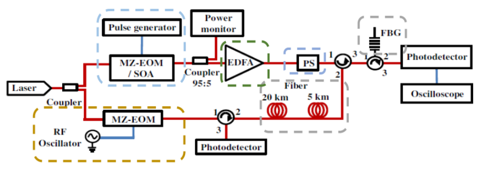 如下圖,窄線寬激光器通過高消光比強度調制器(>40dB,系統(tǒng)可實現100dB高消光比),帶寬~10.8GHz,經過脈沖調制,經過EDFA放大后,通過擾偏器消除偏振影響,再通過環(huán)形器實現遠距離傳輸,和經過FBG濾波后,通過光電探測器解調和檢波。