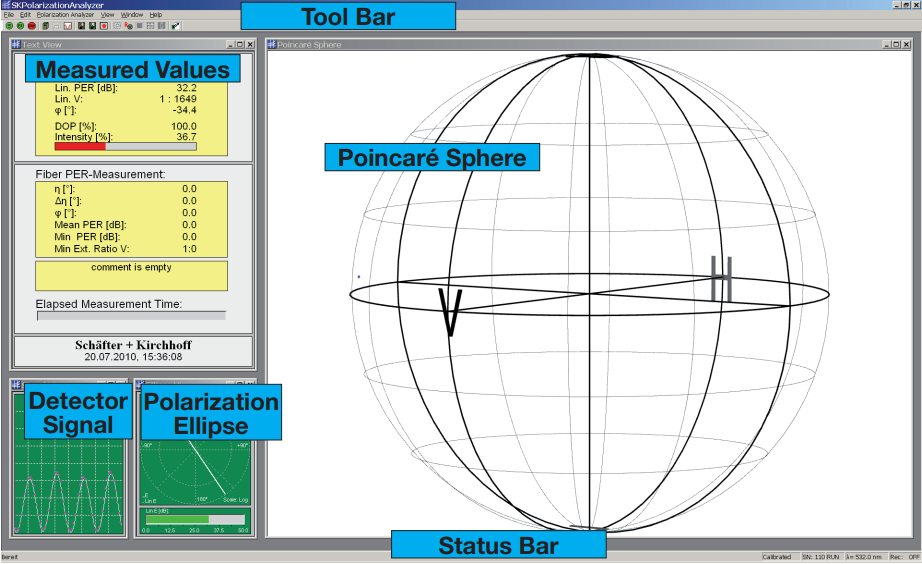 耦合到偏振分析器的輻射在被光電檢測器記錄之前通過旋轉(zhuǎn)的四分之一波片和固定的偏振器。軟件 SKPolarizationAnalyzer 評估從光電二極管信號的詳細(xì)分析和四分之一波片的時間/位置信息中檢索到的斯托克斯參數(shù)。然后在龐加萊球上描繪偏振狀態(tài),其中任何偏振狀態(tài)的變化,包括旋轉(zhuǎn)方向(描繪在北半球或南半球)都很容易看到。同時顯示了偏振橢圓,偏振狀態(tài)的常見表示。 對于相干性低的源,DOP 橢圓補(bǔ)充了偏振可視化。