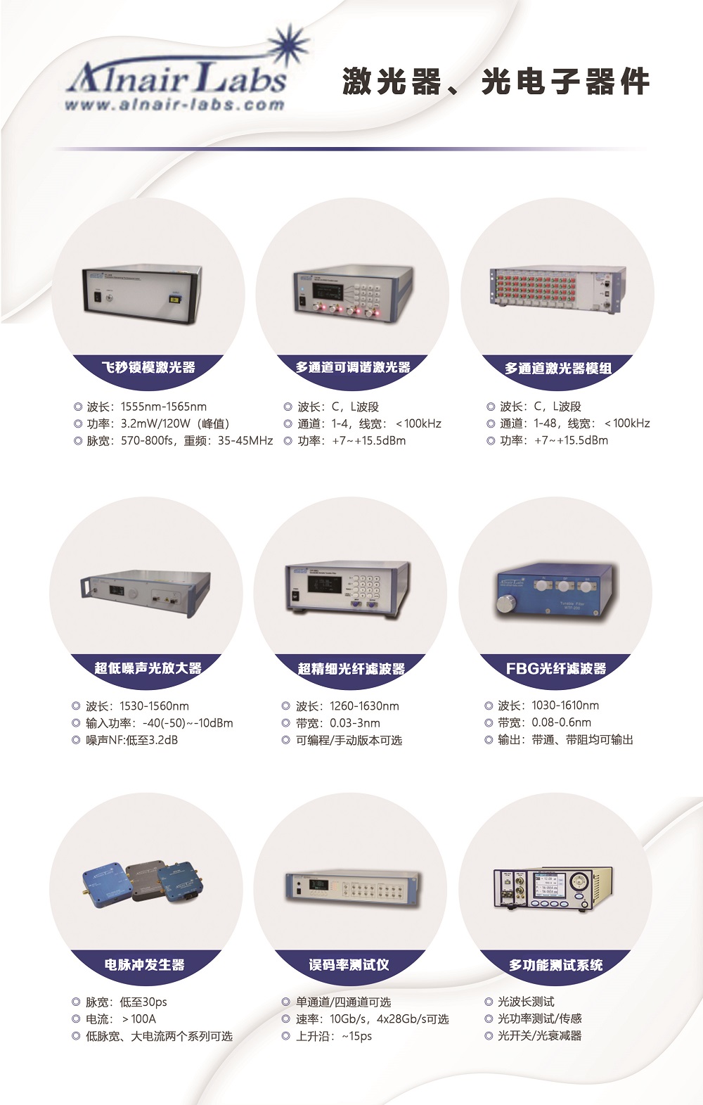 目前提供的主要產(chǎn)品:激光器,寬帶光源,電光調(diào)制器(大量現(xiàn)貨庫存),聲光調(diào)制產(chǎn)品,光放大器,光電探測器/接收器,高速光開關(guān)/開關(guān)矩陣,光纖濾波器,光學(xué)延遲線,偏振相關(guān)器件,自相關(guān)儀,光譜分析儀,太赫茲相關(guān)器件,高速電子產(chǎn)品,數(shù)據(jù)采集卡,激光二極管,激光器驅(qū)動,光纖及光纖熔接處理,光纖干涉儀,氣室/氣池,光學(xué)相干斷層掃描系統(tǒng),相機(jī),OCT光譜儀,掃描振鏡,MEMS振鏡,光機(jī)械器件,光學(xué)平臺。