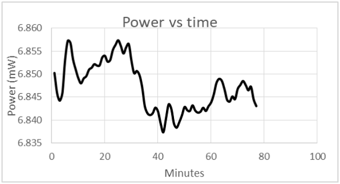 功率與時(shí)間的關(guān)系圖@(室溫,1.5h)顯示了出色的功率穩(wěn)定性,適用于插入損耗測(cè)試等應(yīng)用。