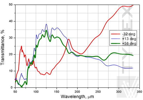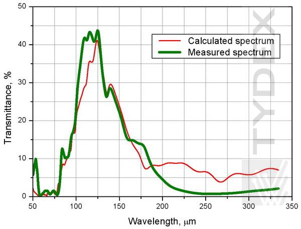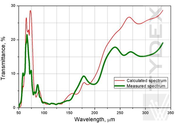 1. TWPC作為半波單色板,適用于80-160μm范圍內(nèi)的任何波長(zhǎng)。TWPC作為120 μm半波片進(jìn)行了測(cè)試。圖1顯示了使用平行偏振器計(jì)算和測(cè)量的TWPC透射光譜的比較。在120 μm處幾乎為零的透射率證實(shí)了在所選波長(zhǎng)處的適當(dāng)偏振轉(zhuǎn)換。