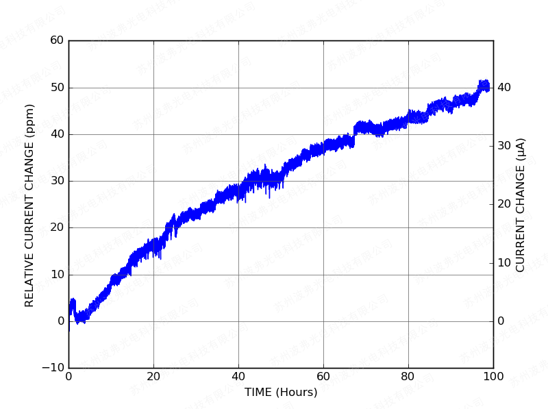 下圖顯示了CTL101激光控制器設(shè)置為800 mA電流(CTL101-2-B-800)在其前100小時運行期間的相對電流變化: